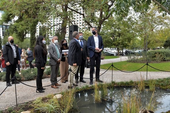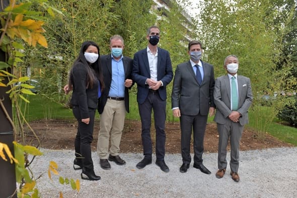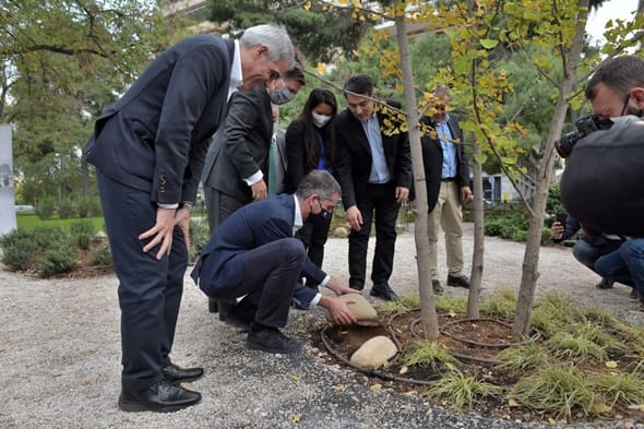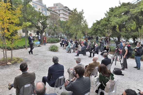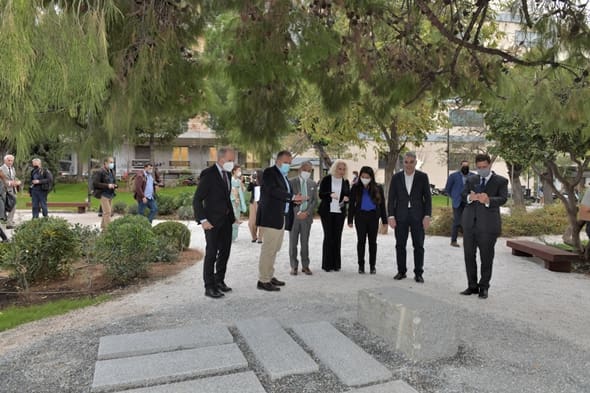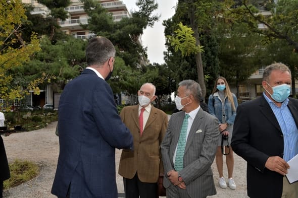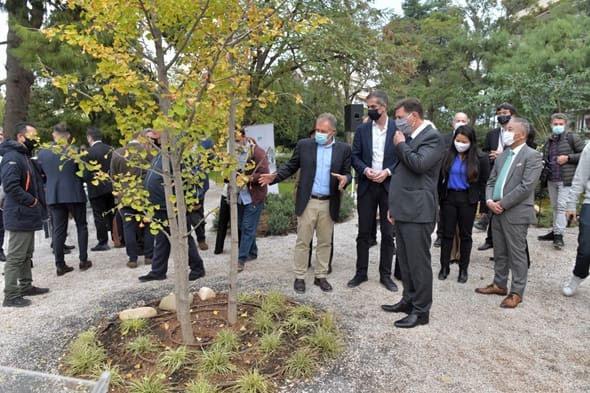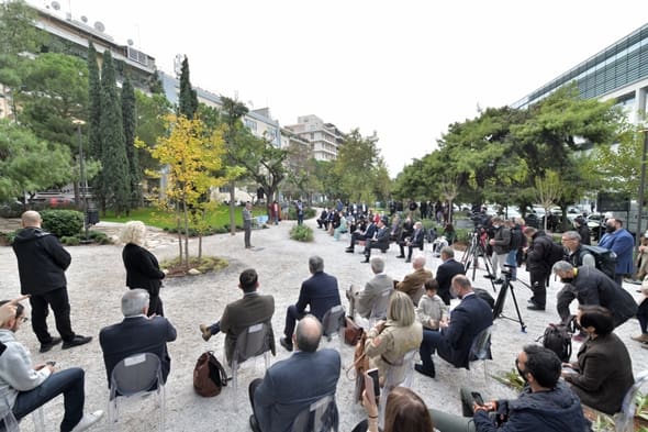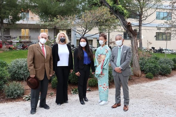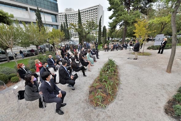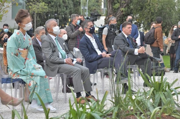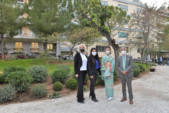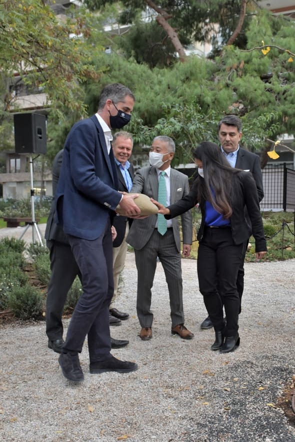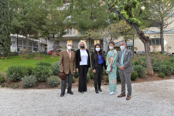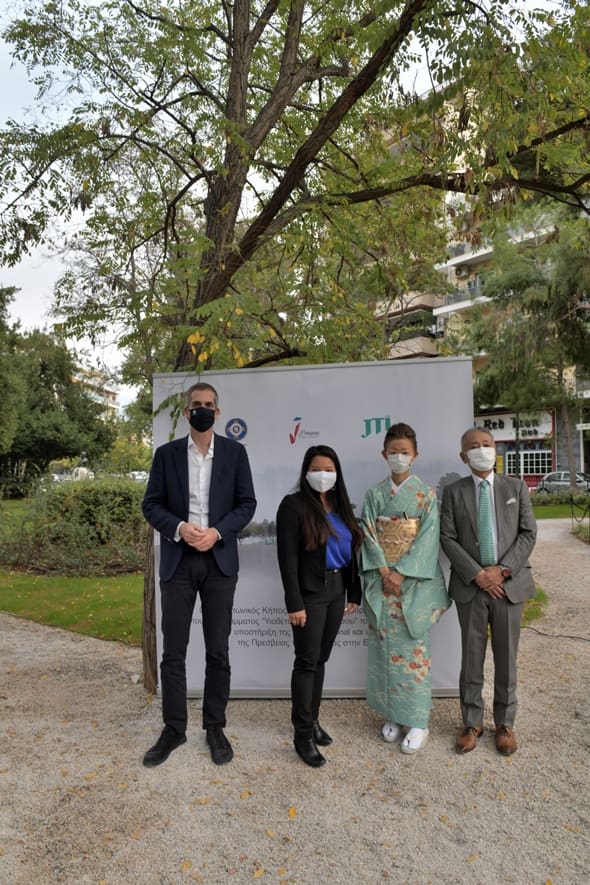 Η τελετή εναπόθεσης του θεμέλιου λίθου στον πρώτο Ιαπωνικό Κήπο πραγματοποιήθηκε από τον Δήμαρχο Αθηναίων Κώστα Μπακογιάννη, τον Πρέσβη της Ιαπωνίας Nakayama Yasunori, τον αναπληρωτή υπουργό Εξωτερικών Μιλτιάδη Βαρβιτσιώτη και την Lili Zigoslu διευθύνουσα σύμβουλο της εταιρείας της JT International Hellas.