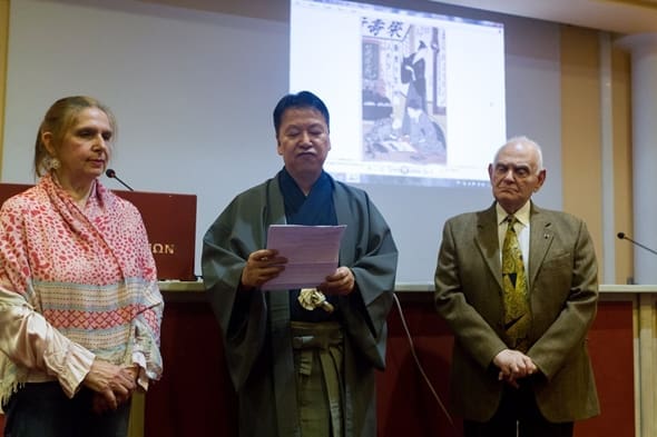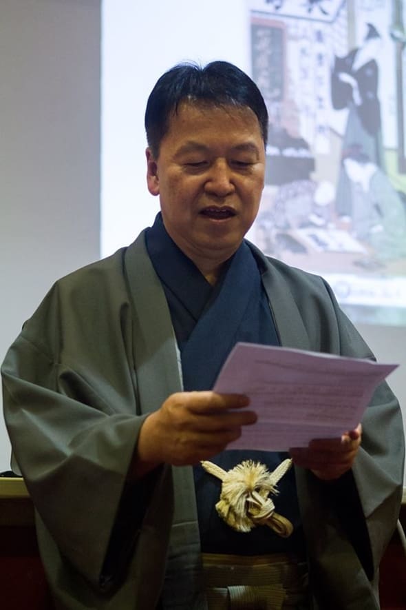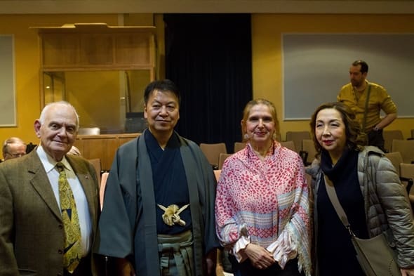 Μετά τον σύντομο χαιρετισμό του Προέδρου του Συνδέσμου Κυρίου Δήμου Βρατσάνου ο Πρέσβης της Ιαπωνίας μίλησε στα ελληνικά σχετικά με την σπουδαία σημασία που κατέχουν στην ιαπωνική κουλτούρα τα ανωτέρω είδη καλλιτεχνικής έκφρασης.