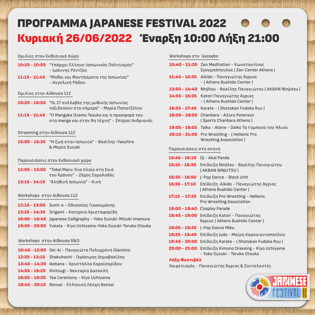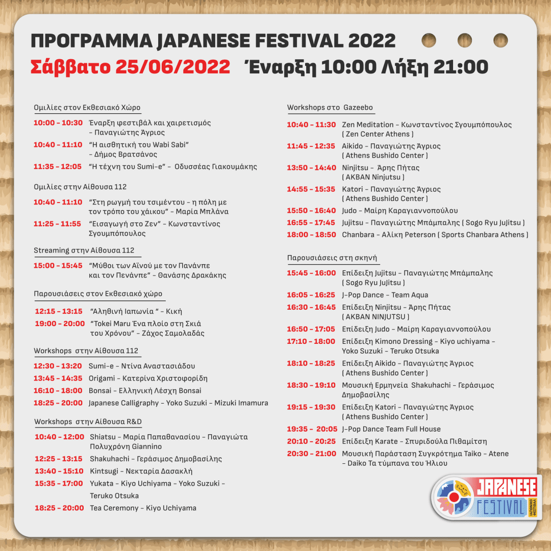 Το Ιαπωνικό Φεστιβάλ πραγματοποιείται από την Ελληνική Ένωση Παραδοσιακών Ιαπωνικών Τεχνών και Πολιτισμού σε συνεργασία με το “Athens Bushido center”, υπό την αιγίδα του “Ελληνο-Ιαπωνικού Συνδέσμου” και της Unesco Νήσων και Πειραιώς, και φιλοξενείται στο Σεράφειο του Δήμου Αθηναίων. Σας προσκαλούμε στο μοναδικό ελληνικό φεστιβάλ που αφορά την Παραδοσιακή και Σύγχρονη Ιαπωνική Κουλτούρα, “Japan Festival 2022”!